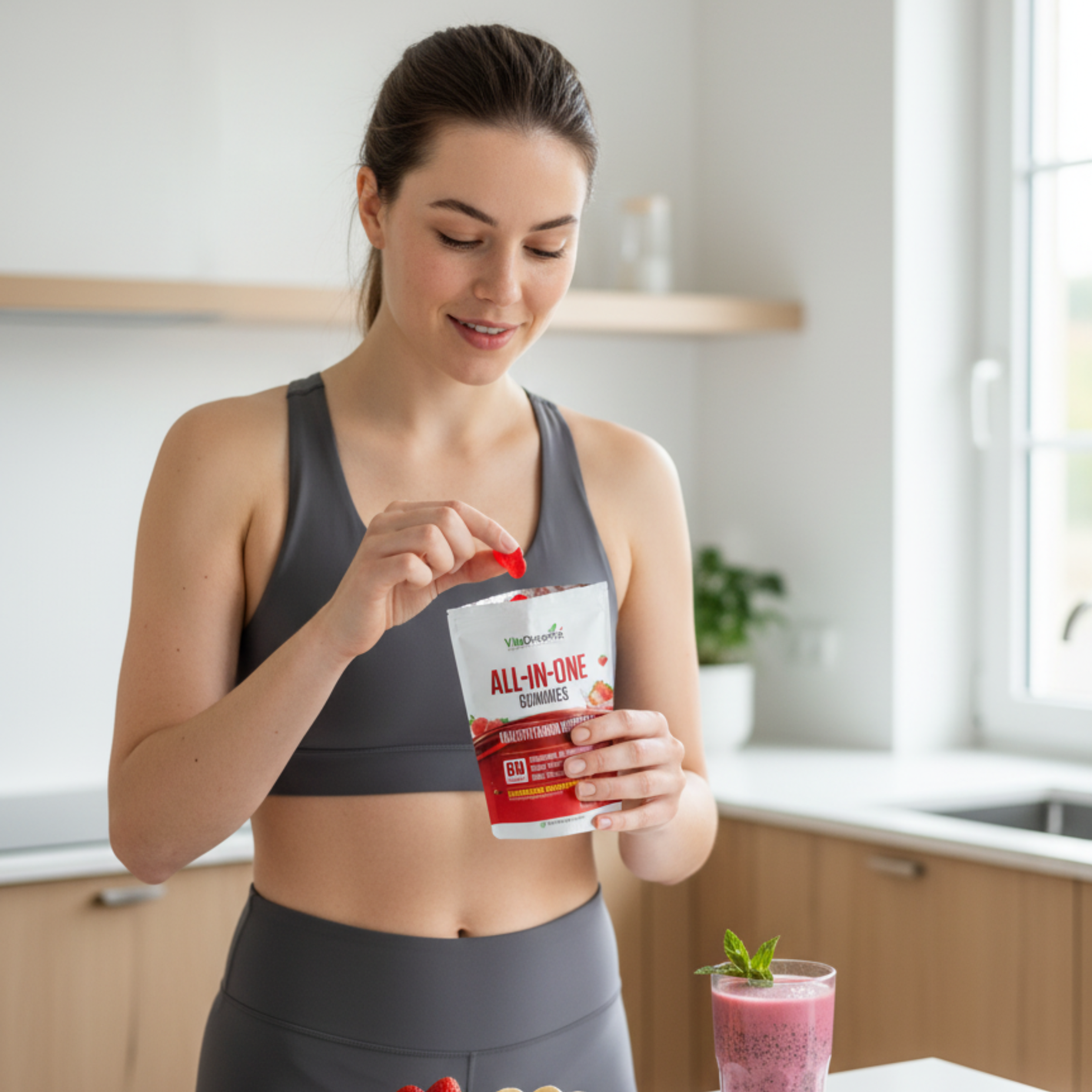 Unsere Formel enthält natürliche Vitamine und Mineralstoffe, gewonnen aus pflanzlichen Rohstoffen und schonend weiterverarbeitet. Die Nährstoffe werden konzentriert, schockgefroren und zu leicht einnehmbaren Gummies geformt.