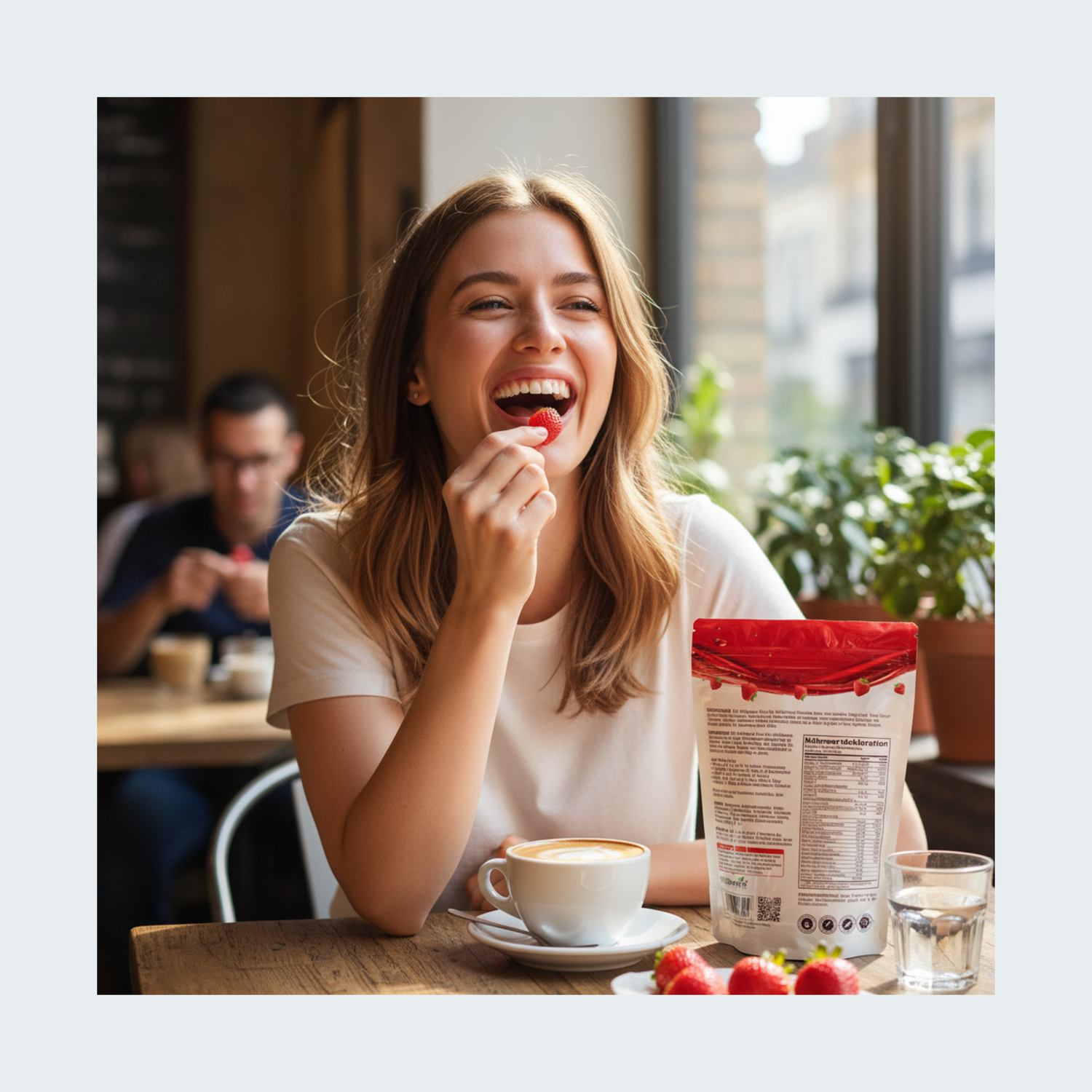 Unser Erdbeer Geschmack kommt aus natürlichen Aromen. Ohne künstliche Farbstoffe und ohne künstliche Süssungsmittel, einfach angenehm fruchtig und natürlich.